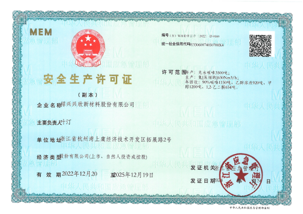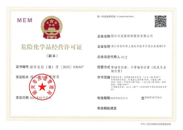 紹興興欣新材料股份有限公司成立于2002年06月27日,占地面積122畝,位于杭州灣上虞經(jīng)濟(jì)技術(shù)開發(fā)區(qū)拓展路2號,現(xiàn)有職工200余人,專業(yè)技術(shù)人員50余人;博士、碩士研究生30余人組成的一支知識型、專業(yè)化的技術(shù)科研團(tuán)隊。公司面向全球市場,專業(yè)開發(fā)電子化學(xué)品、環(huán)保化學(xué)品、醫(yī)藥中間體、高分子材料等先進(jìn)新材料重點領(lǐng)域的省級科技型企業(yè);建有浙江上虞、安徽東至兩個生產(chǎn)基地。目前為“國家高新技術(shù)企業(yè)”、浙江省“隱形冠軍”企業(yè)、浙江省專精特新中小企業(yè);建有“省級”研究開發(fā)中心,共建天津大學(xué)浙江紹興研究院電子化學(xué)品研發(fā)中心。